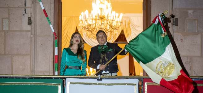 El Mandatario, acompañado de la Senadora Ruth González Silva, hizo sonar las 11 campanadas con el tradicional grito de ¡Viva México!, en alusión al llamado del Cura Hidalgo y a los héroes que nos dieron patria, mismo que fue coreado por las y los potosinos que se congregaron frente al balcón central de Palacio de Gobierno.