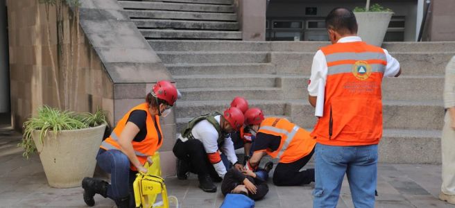 El titular de la dependencia municipal, Adrián Cortázar Ruiz, explicó que se presentaron dos escenarios: un conato de incendio en el área de archivo muerto que fue controlado, y el de una persona lesionada por caída al bajar las escaleras, que fue atendida por un médico y trasladada en ambulancia a un hospital. Comentó que el ejercicio se desarrolló con anticipación en el gabinete municipal, con capacitación a las brigadas que conforman la unidad interna de Protección Civil.