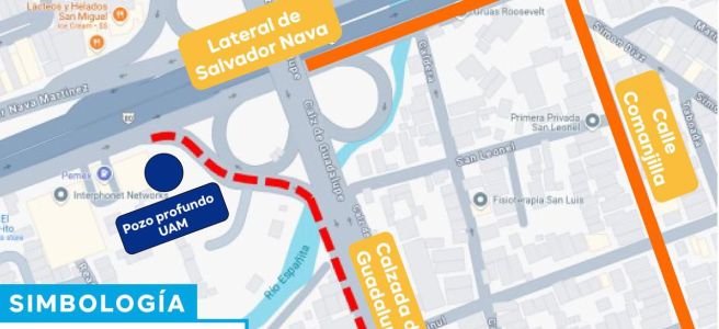 El Gobierno Municipal de San Luis Potosí informó, a través de la Dirección de Obras Públicas, que se realiza un cierre a la circulación sobre la lateral de avenida Salvador Nava y Calzada Guadalupe, debido a que se llevan a cabo trabajos de conexión del pozo profundo UAM, ubicado en esta esquina.