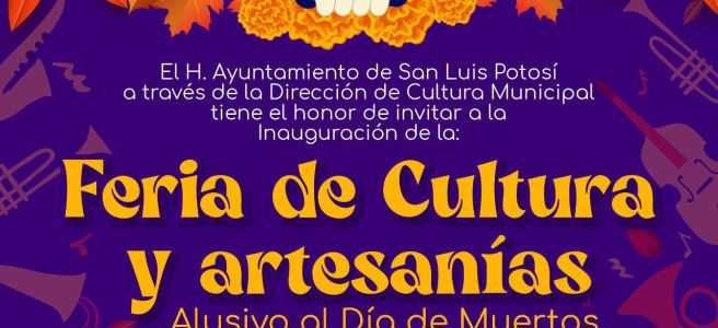 El Gobierno Municipal de San Luis Potosí, a través de la Dirección de Cultura Municipal, invita a la ciudadanía a participar en la Feria de Cultura y Artesanías en conmemoración del Día de Muertos. Este evento se llevará a cabo del 11 al 13 de octubre de 2024 en el patio del Centro Cultural Palacio Municipal, de 10:00 a 19:00 horas.