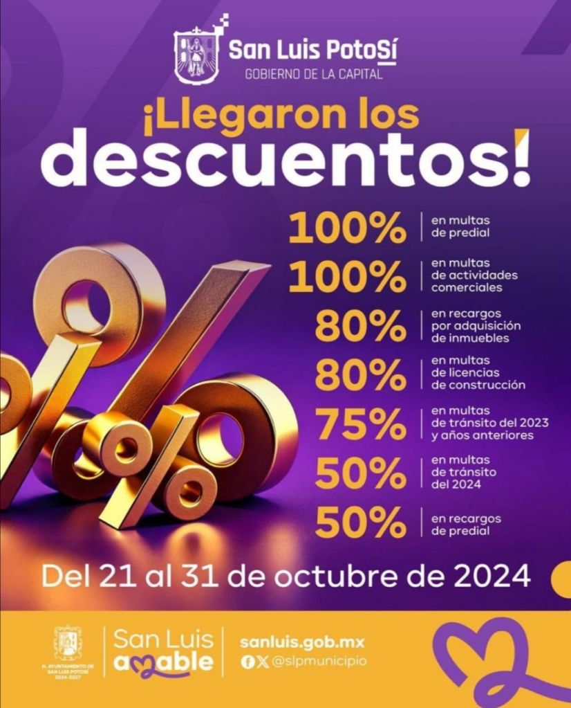 Acerca de las infracciones de tránsito, los descuentos serán del 75 por ciento en multas del 2023 y años anteriores, del 50 por ciento en infracciones de este año, hasta el día 31. Si bien la Campaña de Regularización de Contribuciones Municipales del Gobierno Capitalino se mantendrá durante noviembre y diciembre, los porcentajes variarán, de ahí la invitación a la población contribuyente para que aproveche octubre para ponerse al corriente gracias a los atractivos descuentos.
