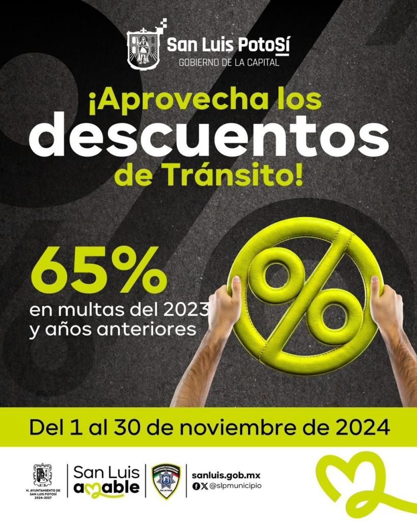 De ahí que a partir del 1 de noviembre hasta finalizar este mes, en el predial se aplicará un 80 por ciento de descuento en multas, y del 50 por ciento en los recargos para quienes tienen algún adeudo por este concepto; en cuanto a infracciones de tránsito, será un 65 por ciento en multas de 2023 y años anteriores.