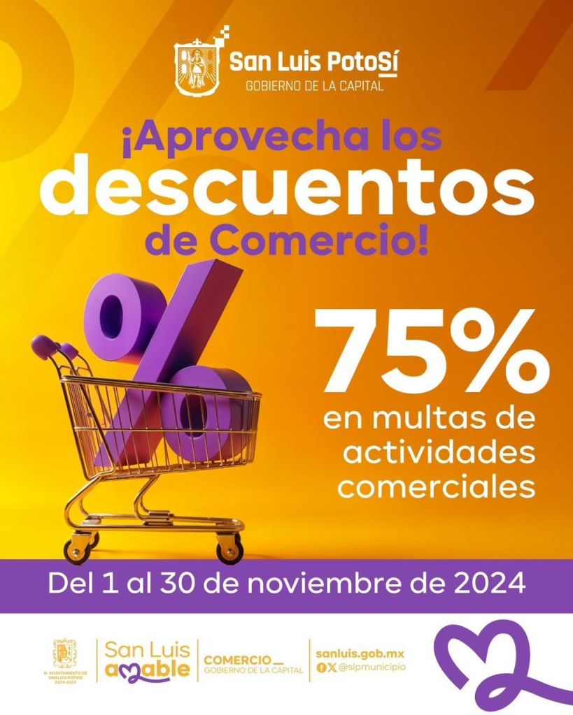 También en actividades comerciales hay descuentos, por lo que del 01 al 30 de noviembre, se puede hacer efectivo un 75 por ciento en multas. Se recordó a quienes deseen aprovechar esta campaña a acercarse a la Unidad Administrativa Municipal ubicada en bulevar Salvador Nava Martínez 1580 en la colonia Santuario, de lunes a viernes de 8 de la mañana a 3 de la tarde.
