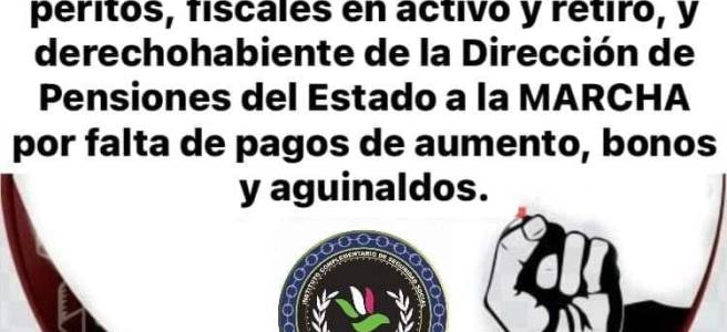 Custodios, agentes de Ministerio Público y policías estatales jubilados y pensionados, marcharon frente al Congreso del Estado, y tambien frente al Palacio de Gobierno estatal para exigir el pago de sus pensiones y de las prestaciones a las que tienen derecho.