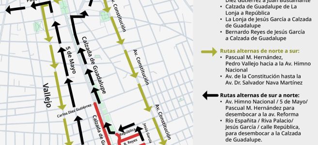 Para ello, la Dirección General de Policía Vial y Movilidad habilitará como rutas alternas de norte a sur las calles de Miguel Barragán, Pedro Vallejo hacia a la Av. Himno Nacional. También la avenida Constitución hasta Salvador Nava Martínez.
