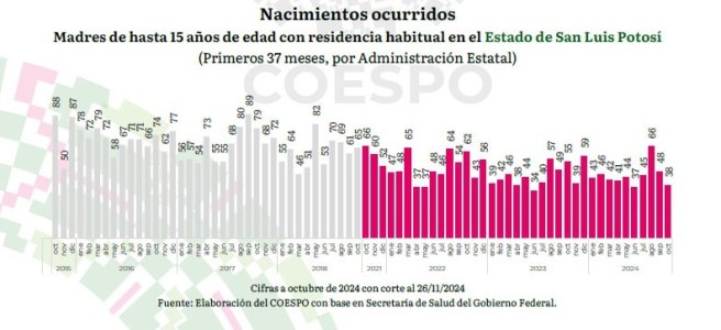 Finalmente, dijo que durante los primeros 37 meses de la administración han disminuido los nacimientos ocurridos en madres de hasta 19 años, pasando de 586 en octubre de 2021 a 438 en octubre de 2024, mientras que los nacimientos ocurridos en madres de hasta 15 años, la cifra pasó de 66 en octubre de 2021 a 38 en octubre de 2024.