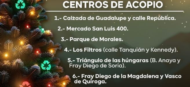 Los puntos para la recepción de los árboles son: Parque de Morales, en los invernaderos municipales, en el llamado Triángulo de las Húngaras (Ricardo B. Anaya), Planta Potabilizadora Los Filtros, Mercado San Luis 400, Calzada de Guadalupe y Calle República, y Fray Diego de la Magdalena.