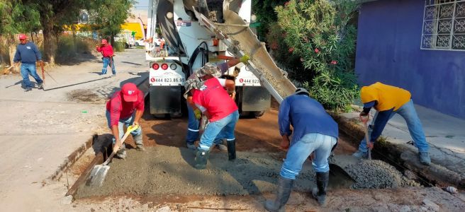 Con material de concreto está en proceso la calle Ópalo, en el tramo de Industrias a Acerina de la colonia Esmeralda; así como la reposición de piezas de adoquín en la calle Netzahualcóyotl, de la calle Tangamanga a Reforma, en el Barrio de Tlaxcala.