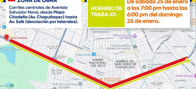 Este sábado 25 de enero, el Ayuntamiento de San Luis Potosí arranca una jornada intensiva de rehabilitación en la avenida Salvador Nava Martínez, con trabajos que arrancarán a las 19 horas y se prolongarán hasta mañana domingo a las 18 horas, en turnos diurnos y nocturnos.