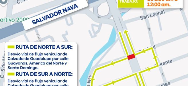 De igual manera, se habilitará cierre vial en la lateral de la avenida Salvador Nava Martínez hacia la Calzada de Guadalupe en dirección al sur, para facilitar las maniobras del personal que estará laborando en el lugar.