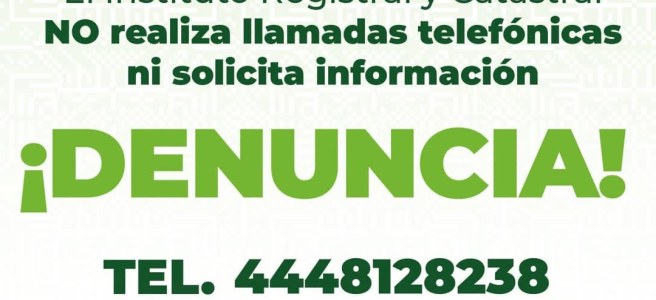 El Instituto Registral y Catastral (IRC), exhortó a la población a extremar precauciones para evitar ser víctima de fraude, tras recordar que la dependencia nunca solicita información de sus predios y viviendas por medio de correo electrónico o por teléfono, por lo que invitó a las y los potosinos a acudir a las oficinas del Instituto para solicitar orientación o iniciar algún trámite, de lunes a viernes de las 8:00 a las 16:00 horas.