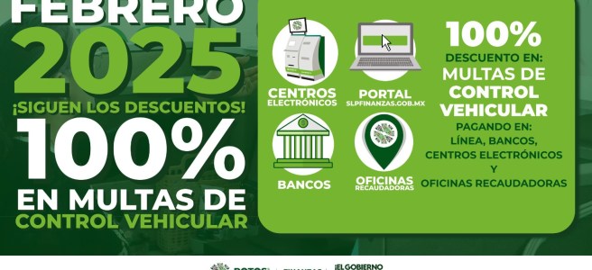 Con el compromiso de brindar más apoyo a las familias potosinas y su economía, la Secretaría de Finanzas (Sefin), amplió el programa de 100 por ciento de descuento en multas de control vehicular durante febrero, en pagos a través de herramientas digitales, centros electrónicos, instituciones bancarias o en oficinas recaudadoras.