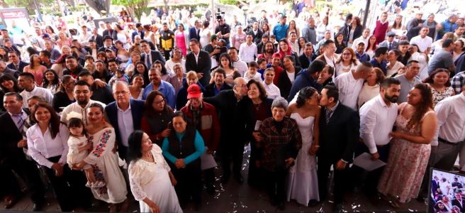 En un emotivo evento que tuvo como escenario la Plaza de Armas, frente al Centro Cultural Palacio Municipal, 190 parejas formalizaron su unión civil a través del programa “Da el Sí con la Familia”, impulsado por el DIF Municipal y el Gobierno de la Capital, donde la Presidenta de este organismo, Estela Arriaga Márquez, y el Alcalde Enrique Galindo Ceballos, fungieron como testigos de honor en este acto que fortalece los lazos familiares y brinda certeza jurídica a las parejas potosinas.