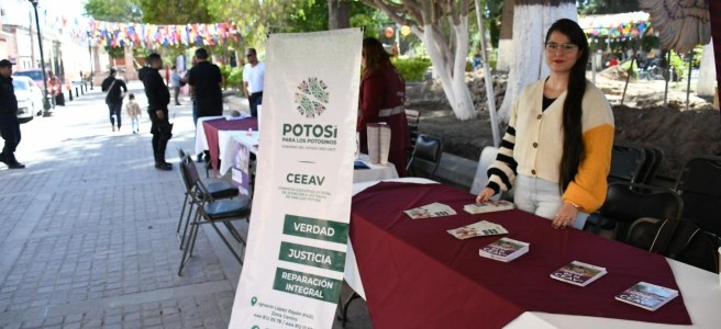 Para ampliar los servicios y acercar más apoyo a las y los potosinos que más lo requieren, la Comisión Ejecutiva Estatal de Atención a Víctimas (CEEAV), participó con un módulo de atención en la “Feria de los Servicios por la Paz” en Santa María del Río, con atención personal relacionado con la protección, ayuda, asistencia, defensa de derechos humanos, acceso a la justicia, a la verdad y a la reparación integral, entre otras.