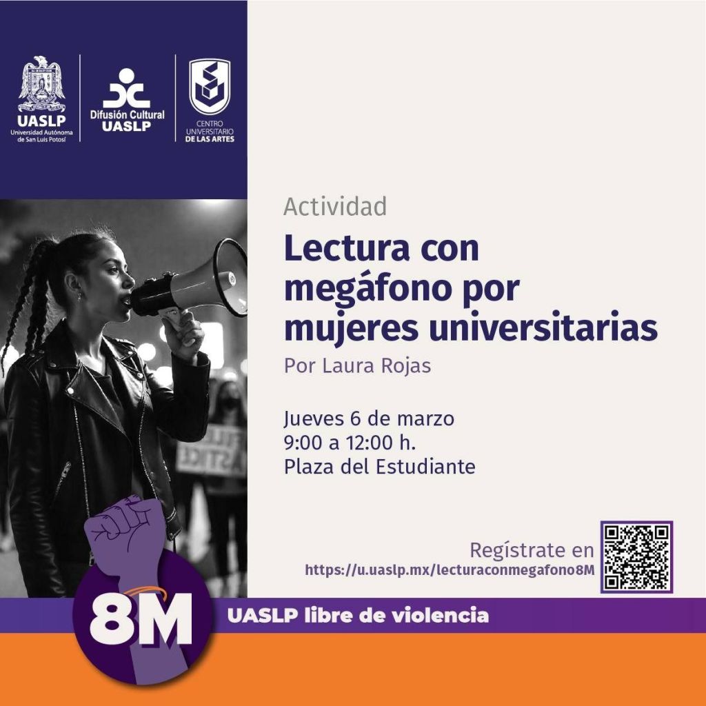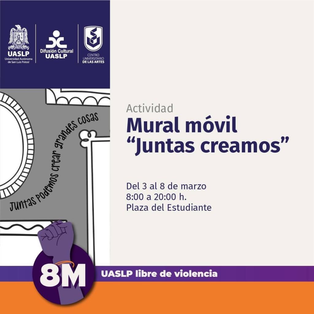 En el marco de la conmemoración del Día Internacional de la Mujer, el Centro Universitario de las Artes (CUART), adscrito a la Secretaría de Difusión Cultural de la Universidad Autónoma de San Luis Potosí (UASLP), lanzó la convocatoria a la comunidad estudiantil y docente a participar en dos actividades: Lectura con megáfono por mujeres universitarias y Mural móvil “Juntas creamos”.