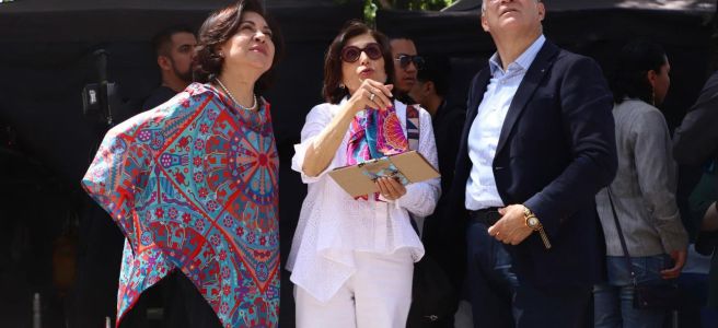 El Alcalde Enrique Galindo Ceballos visitó el set acompañado de la Presidenta del DIF Municipal, Estela Arriaga Márquez, la escritora Ángeles Mastretta y de la Directora de Turismo, Claudia Peralta Antiga, para dar la bienvenida al equipo de producción. Durante el recorrido, reafirmó el compromiso del Gobierno de la Capital para impulsar proyectos que promuevan el desarrollo cultural y turístico.
