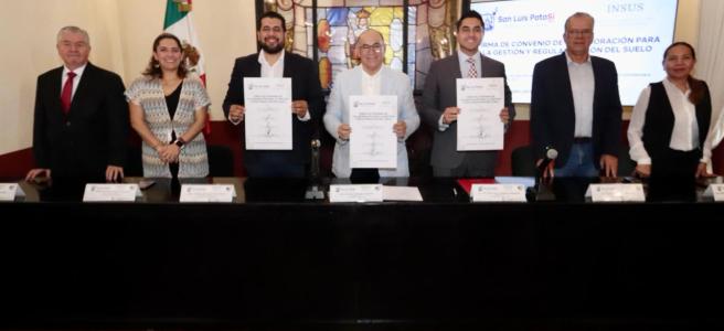 El Ayuntamiento de San Luis Potosí firmó un Convenio de Colaboración con el Instituto Nacional del Suelo Sustentable (Insus) para fortalecer la gestión y regularización del suelo en el municipio. El acuerdo fue suscrito por el Presidente Municipal Enrique Galindo Ceballos, el representante del INSUS en San Luis Potosí, Yeraldo Emanuel Torres Flores, el Secretario General del Ayuntamiento, Fernando Chávez Méndez, y el Síndico Víctor Hugo Salgado Delgadillo.