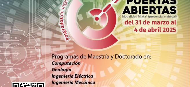 La Facultad de Ingeniería de la Universidad Autónoma de San Luis Potosí (UASLP), a través del Centro de Investigación y Estudios de Posgrado, el Instituto de Geología y el Instituto de Metalurgia, llevará a cabo el evento “Puertas abiertas. Posgrados de Ingeniería a tu alcance” del lunes 31 de marzo al viernes 4 de abril de 2025, en modalidad mixta.