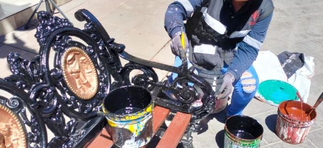 Personal de la Dirección de Servicios Municipales labora actualmente en el arreglo y pintura de bancas en la Plaza de Armas y en la zona peatonal de la calle Zaragoza, además de estar al pendiente de cualquier desperfecto que pudieran detectar para proceder a su reparación.