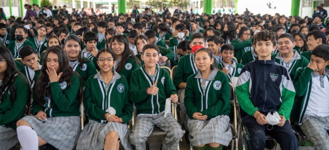 Posteriormente, Ricardo Gallardo se dirigió a la secundaria Ignacio Manuel Altamirano para entregar más pólizas. Ahí anunció la construcción de una cancha de fútbol rápido con pasto sintético y computadoras.