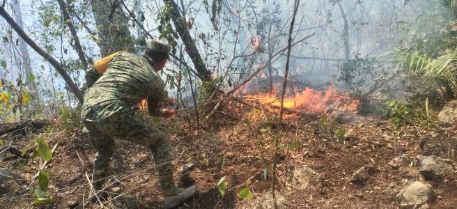 Durante el periodo comprendido del 10 al 16 de abril, el personal militar ha intensificado de manera significativa sus actividades de apoyo en la sofocación de incendios, destacando el empleo de una aeronave de ala rotativa MI-17, Mat. 1709, Pert. a la F.A.M., la cual ha sido fundamental para la reubicación de brigadistas, vuelos de reconocimiento, así como para la realización de 111 descargas de agua con helibalde en los incendios de Peña Amarilla, Ciudad del Maíz, y Buenavista, Xilitla.
