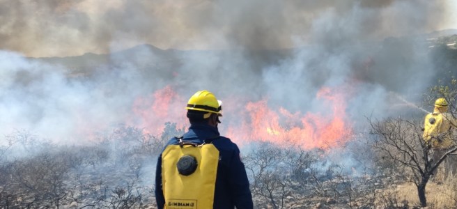 Brigadistas de los tres niveles de Gobierno y voluntarios atendieron un incendio de pastizal y matorral que se registra en la comunidad de Derramaderos, en Mexquitic de Carmona.