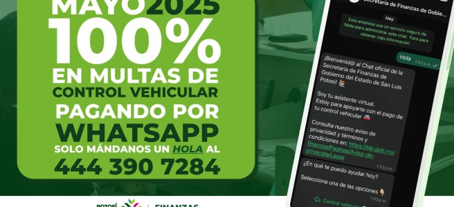 El Gobierno del Estado de San Luis Potosí, a través de la Secretaría de Finanzas (Sefin), implementa durante el mes de mayo un programa de descuento total en el pago de multas de control vehicular, exclusivamente al realizar el trámite a través de WhatsApp.