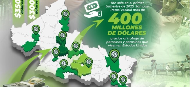 En San Luis Potosí, en el primer trimestre de 2025, se recibieron más de 400 millones de dólares gracias al trabajo de potosinas y potosinos que viven en Estados Unidos los cuales mandan ingresos a sus familias que en promedio oscilan entre 300 y 380 dólares mensuales.