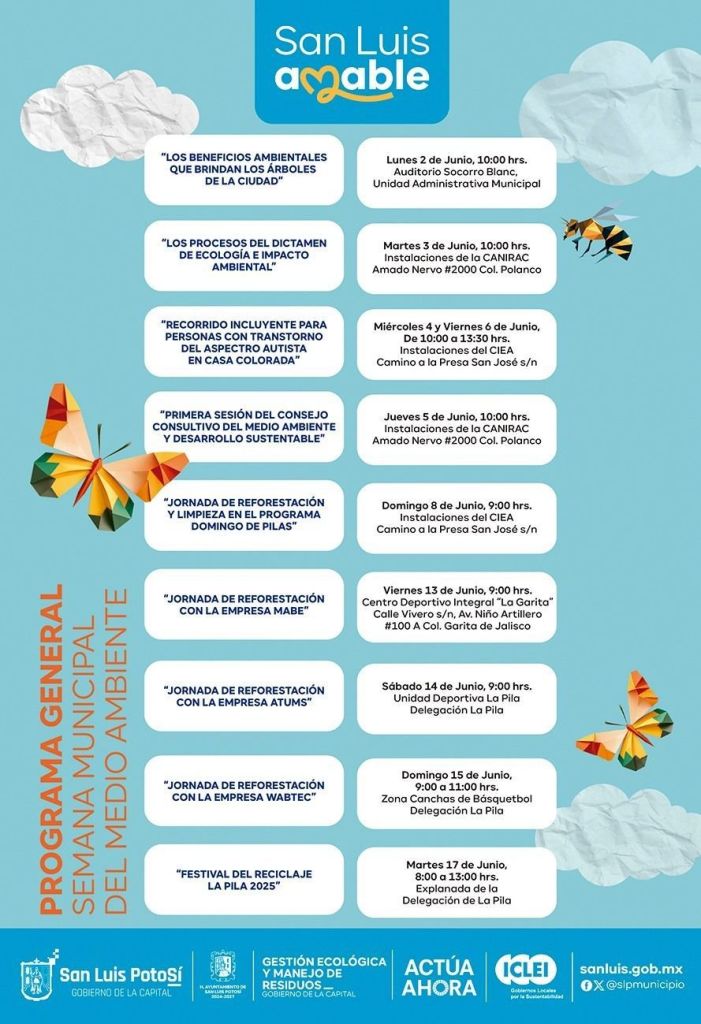 El Gobierno de la Capital de San Luis Potosí dio a conocer que se realizará la Semana Municipal del Medio Ambiente del lunes 2 al domingo 8 de junio, y también habrá actividades del 13 al 17 del mismo mes, por lo que se hace una atenta invitación a diversos sectores para que se sumen a este programa a favor de la ecología.