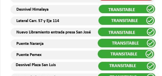 Como medida preventiva y para garantizar la seguridad de las personas, se mantiene el cierre temporal de las siguientes vialidades: el desnivel Manuel José Othón, el desnivel de la glorieta González Bocanegra y el paso vehicular sobre Río Españita.