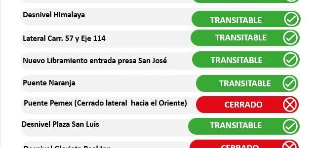 Al momento, la Dirección General de Policía Vial ha realizado el cierre al paso de vehículos en el Río Santiago en el tramo de Sierra Leona a Muñoz, en la jurisdicción del municipio de San Luis Potosí. También ha quedado cerrado al paso de vehículos el Río Españita y la lateral en dirección al oriente de la avenida Salvador Nava Martínez y puente Pemex.