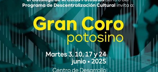 La creación del Gran Coro Municipal Potosino se está realizando en el Centro de Desarrollo Comunitario de Simón Díaz, las sesiones próximas son 16, 23 y 30 de junio; mientras que en el Centro de Progreso se realizarán el 17 y 24 de junio, habiendo todavía espacios disponibles.