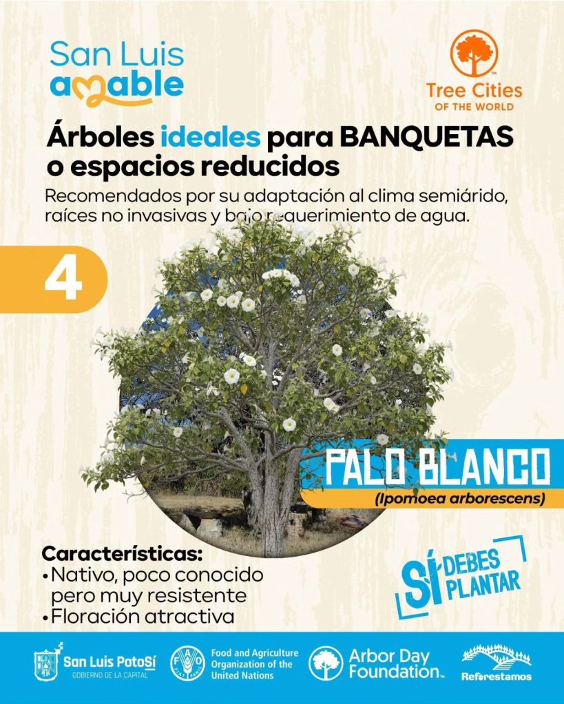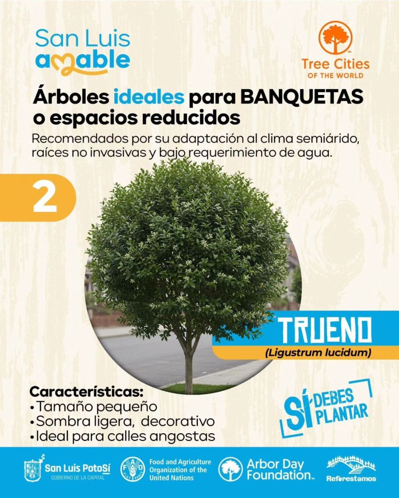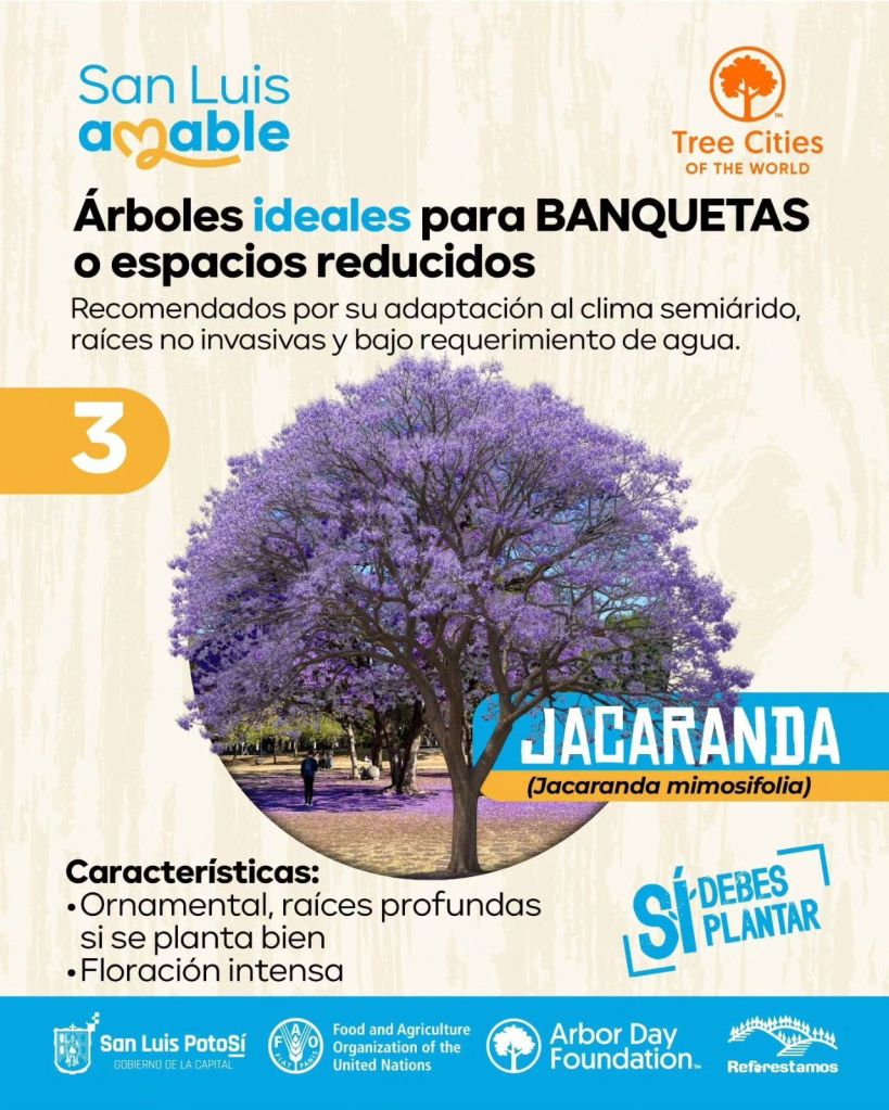 Entre las especies sugeridas destacan el Tepehuaje, el Trueno, la Jacaranda y el Palo Blanco, todos con características que los hacen compatibles con las condiciones urbanas de la Capital potosina. Estas opciones no solo embellecen la ciudad, sino que también contribuyen al equilibrio ambiental sin dañar infraestructura urbana como banquetas o drenajes.