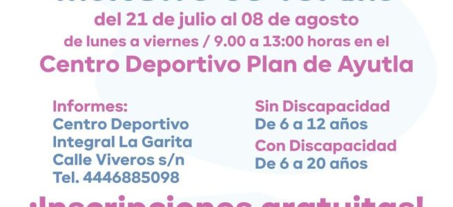 La edición de este año del Campamento Municipal Inclusivo de Verano se realizará en el Centro Deportivo “Plan de Ayutla” de las 9 de la mañana hasta la 1 de la tarde en los días antes mencionados, y va dirigido a niñas, niños y adolescentes –con discapacidad, edades 6 a 20 años; y sin discapacidad de 6 a 12 años-.