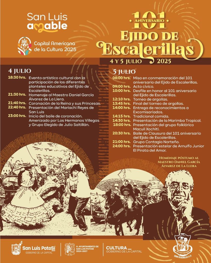 El Ayuntamiento de la Capital, junto con las autoridades ejidales, invitan a la población potosina al aniversario 101 de Escalerillas, conmemoración que se realizará con una serie de eventos gratuitos que iniciarán este viernes 4 y sábado 5 de julio.