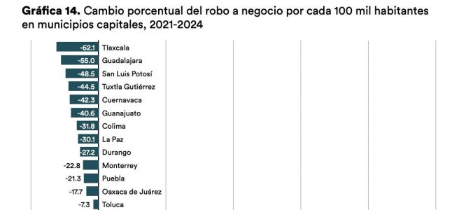 Según el estudio, el delito de extorsión presentó una tasa de 6.15 por cada 100 mil habitantes, por debajo del promedio nacional de 9.0. En feminicidio, San Luis Potosí se ubicó con la décima tasa más baja del país (0.5 frente al promedio nacional de 0.68), con una disminución del 3.4% en el periodo de 2021 a 2024. También se reportó una reducción del 30% en homicidios dolosos, mientras que el secuestro bajó en 64.88%, la sexta mayor reducción entre capitales estatales. En robo a negocio, la baja fue de 48.5%, la tercera más alta a nivel nacional, y el robo de vehículo descendió 29.5%.