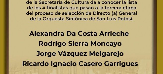 Los aspirantes que avanzaron son Alexandra Da Costa Arrieche, Rodrigo Sierra Moncayo, Jorge Vázquez Melgarejo y Ricardo Ignacio Casero Garrigues en una fase en la que se consideran sus propuestas artísticas y experiencia para garantizar una designación profesional, transparente y en sintonía con la visión de la OSSLP.