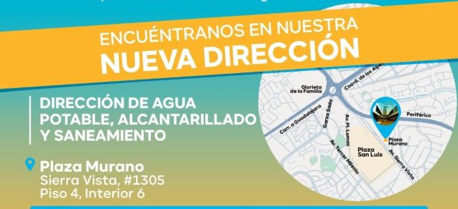 La Dirección de Agua, Alcantarillado y Saneamiento del Gobierno Municipal de San Luis Potosí da a conocer su nuevo domicilio, a fin de que la población a la que atiende realice algún trámite directamente en sus oficinas.