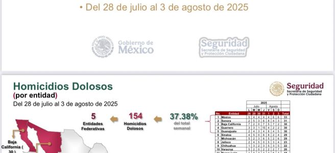 El informe expuso que San Luis Potosí apenas alcanzó el 0.4 por ciento del total de homicidios dolosos, mientras que cinco entidades concentraron 154 casos, equivalentes al 37.38 por ciento del total de los 412 homicidios.