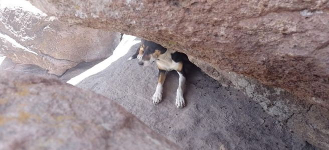 Gracias a un reporte ciudadano, este lunes se logró el exitoso rescate de un perrito que había quedado atrapado entre las rocas en una zona de difícil acceso de la Sierra de San Miguelito, cerca del cerro de la Virgen del Chorrito. El llamado lo atendió el personal del área de Bienestar Animal, en colaboración con rescatistas voluntarios, quienes no dudaron en escalar para auxiliar al animal.