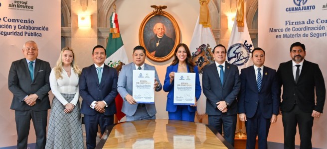 El Gobernador de San Luis Potosí Ricardo Gallardo Cardona, y su homóloga de Guanajuato, Libia Dennise García Muñoz Ledo, firmaron un convenio de coordinación en materia de seguridad, con el objetivo de fortalecer la cooperación entre ambas entidades y consolidar un esquema de seguridad que permita actuar de manera conjunta y efectiva a favor de la paz y la tranquilidad de las familias de la región bajío.