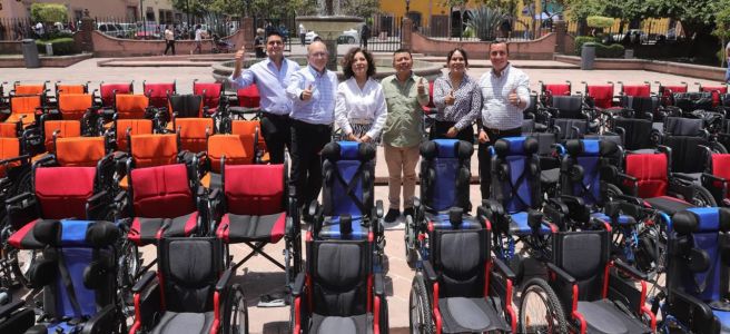 En la Plaza de Aranzazú el Alcalde Enrique Galindo Ceballos y la Presidenta del DIF Municipal, Estela Arriaga Márquez, encabezaron la entrega masiva de sillas de ruedas y bastones a niñas, niños, adolescentes, personas adultas y adultas mayores, con o sin discapacidad.