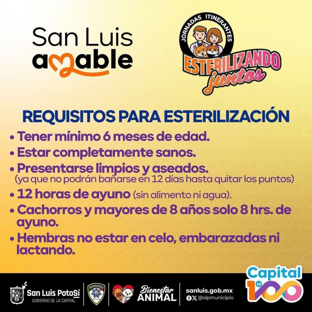 Para conocer los requisitos y agendar la cita respectiva, se recordó que se puede marcar al teléfono: 4421-865857, asimismo, pueden consultar la página: https://www.facebook.com/BienestarAnimalSLP, para conocer más actividades institucionales a favor de los animales.