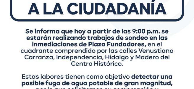 Este lunes 13 de octubre, a partir de las 21:00 horas, Interapas llevará a cabo trabajos para la detección de fugas en redes de agua potable sobre las inmediaciones de Plaza Fundadores.