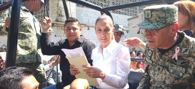 La Presidenta y el Gobernador recorren en un Jeep militar las calles donde han sido recibidos por familias que les agradecen la intervención oportuna ante las inundaciones que afectaron gran parte de la huasteca potosina.