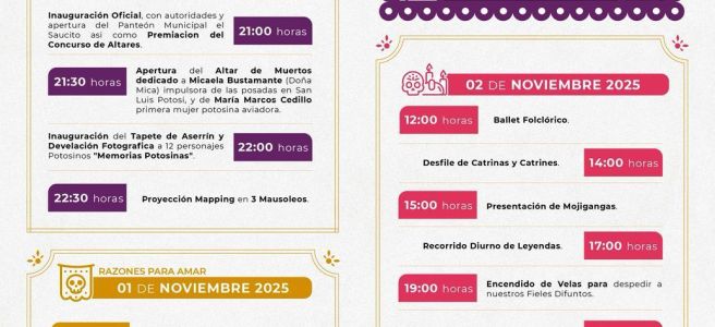 La inauguración oficial del Festival Razones para Recordar será con la apertura del panteón El Saucito y la premiación del concurso de altares el próximo viernes a partir de las 9 de la noche; para posteriormente abrir el altar de Muertos dedicado a Micaela Bustamante impulsora de las posadas en la ciudad y en honor a la primera potosina aviadora, María Marcos Cedillo; después se inaugurará el tapete de aserrín y develación fotográfica de 12 personajes de San Luis y esa noche se concluirá con la proyección mapping en Mausoleos del citado cementerio.