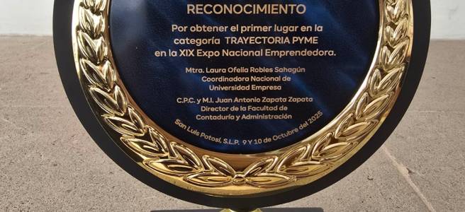 La Facultad de Contaduría y Administración de la Universidad Autónoma de San Luis Potosí (UASLP) obtuvo el primer lugar en la categoría Trayectoria PyME durante la XIX Expo Nacional Emprendedora de la Asociación Nacional de Facultades y Escuelas de Contaduría y Administración (ANFECA). El reconocimiento fue otorgado al estudiante Héctor Samuel Meléndez Báez y al contador público Ramiro Güereque Luviano, docente y asesor del trabajo.