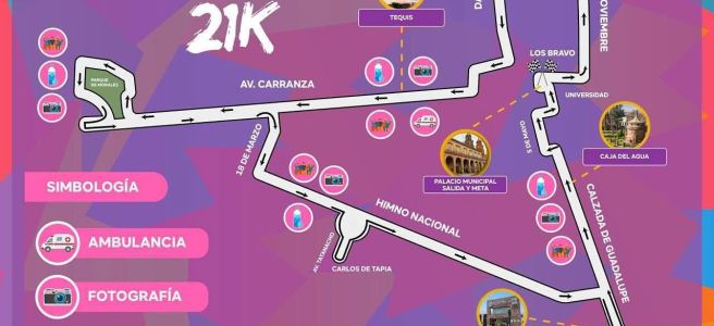 La ruta de 21 kilómetros, desde su salida en Plaza de Armas, seguirá el mismo recorrido que la ruta de 10 km, pero continuará por Venustiano Carranza hasta la Glorieta González Bocanegra hacia avenida de los Artistas, Arboledas, Pintores y la calle de Carlos Canseco (en sentido contrario al establecido).