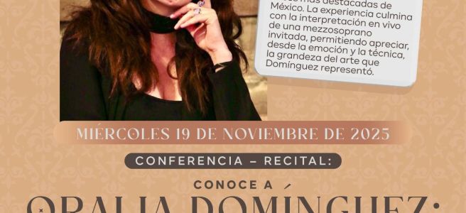 Conferencia–Recital “Conoce a Oralia Domínguez: Vida artística de la gran mezzosoprano potosina”, que se llevará a cabo el 19 de noviembre de 2025 en el Centro Cultural Palacio Municipal, en punto de las 19:30 horas.