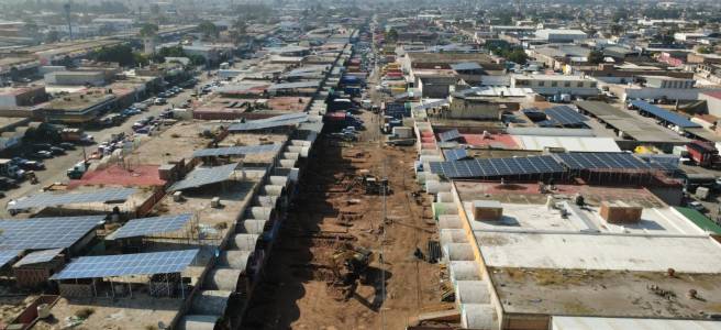 La modernización de la zona de abastos avanza de manera sostenida con los trabajos que se desarrollan en Calle Sexta, tanto en su tramo oriente como poniente, donde la Secretaría de Desarrollo Urbano, Vivienda y Obras Públicas (Seduvop) registra ya un avance del 50 por ciento.